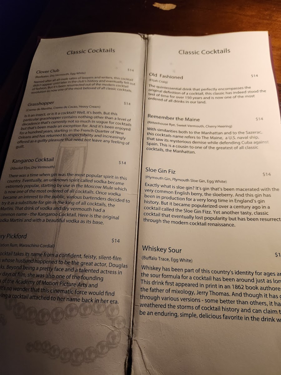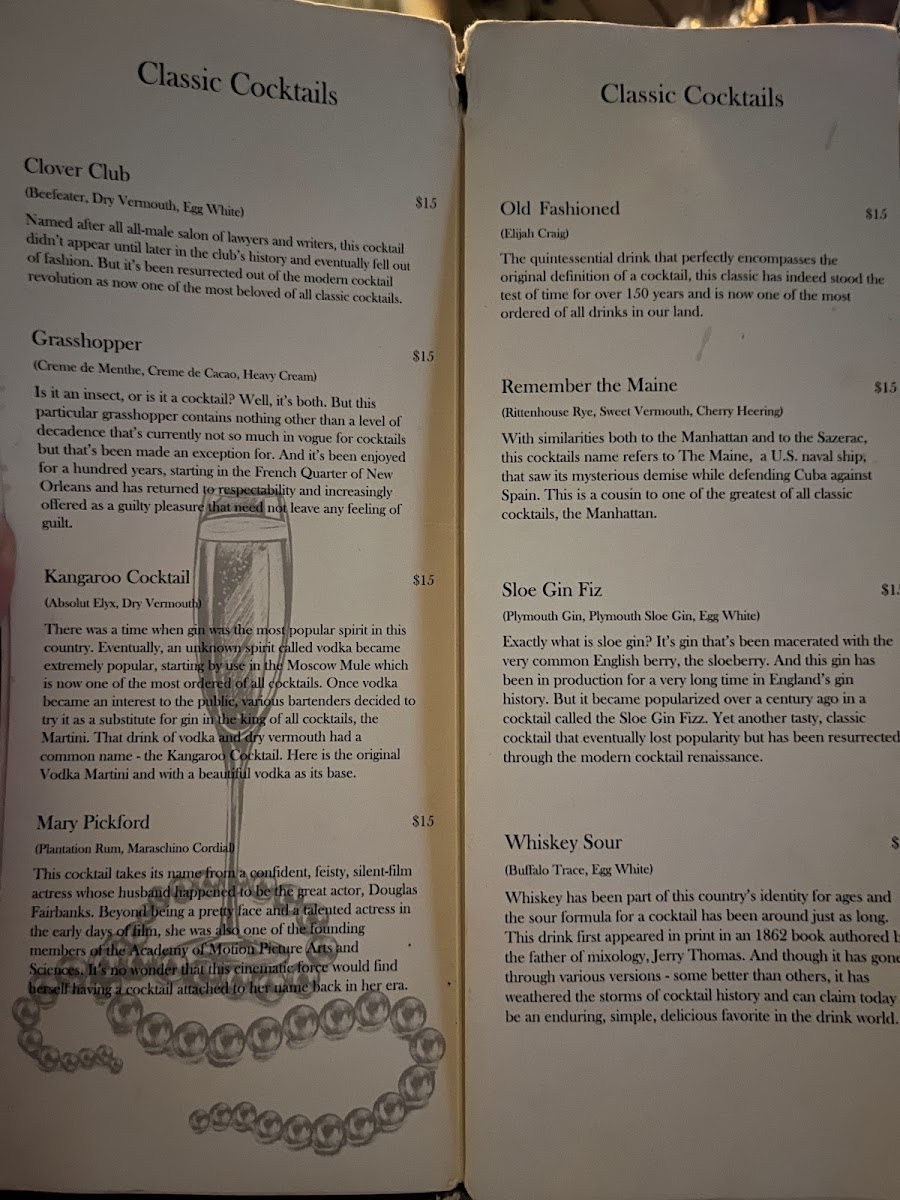 The menu at Room One Eleven offers a thoughtfully curated selection of cocktails and casual bites that complement its intimate speakeasy atmosphere. Here, handcrafted drinks like the Espresso Martini, Whiskey Sour, and Vanilla Black Manhattan set the tone for evenings spent unwinding with friends or enjoying a quiet night out.